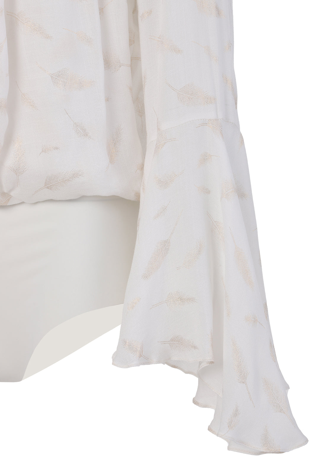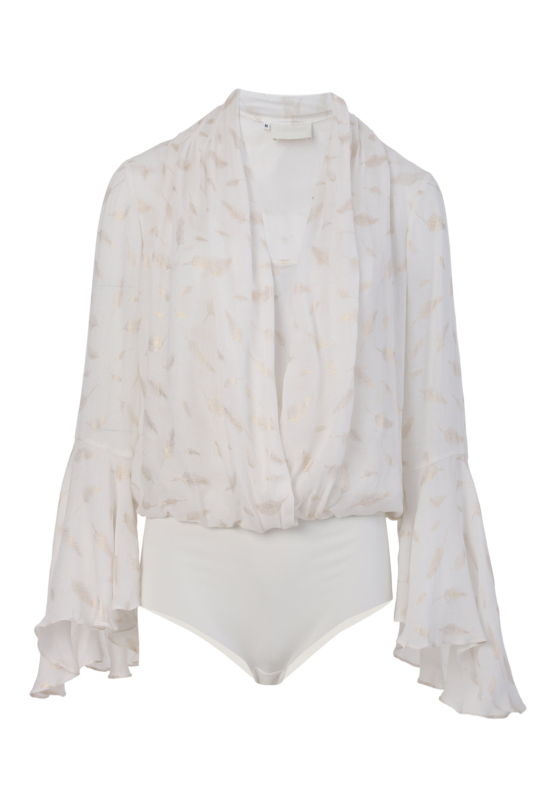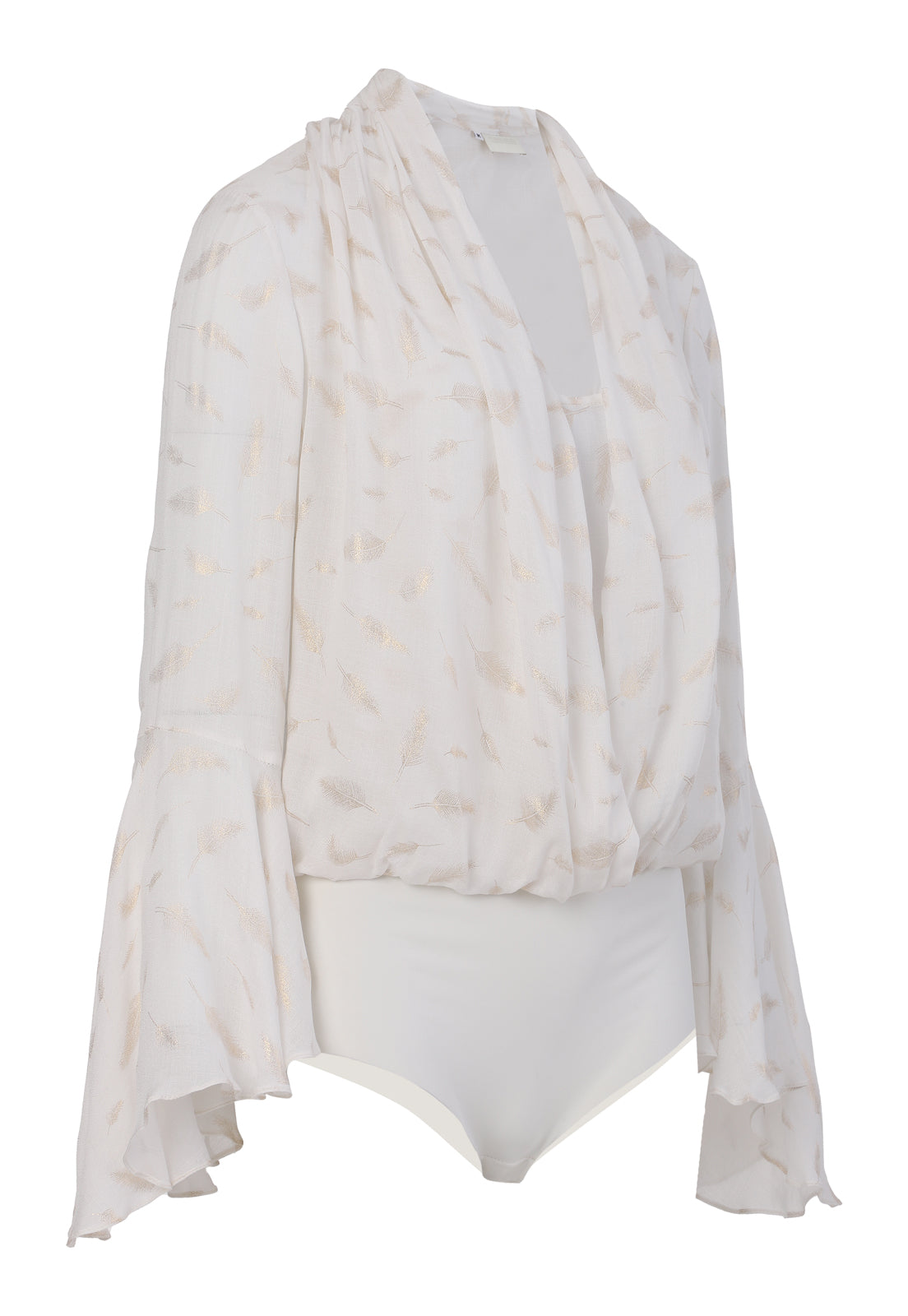 PIEZA ÚNICA . Body en tela chalis ecológica con figuras bordadas en hilos metalizados. El cuello es de escote profundo y drapeado . Lleva una pieza en el delantero que hace de top interno. El panty es elaborado en lycra sin costuras para una máxima comodidad.