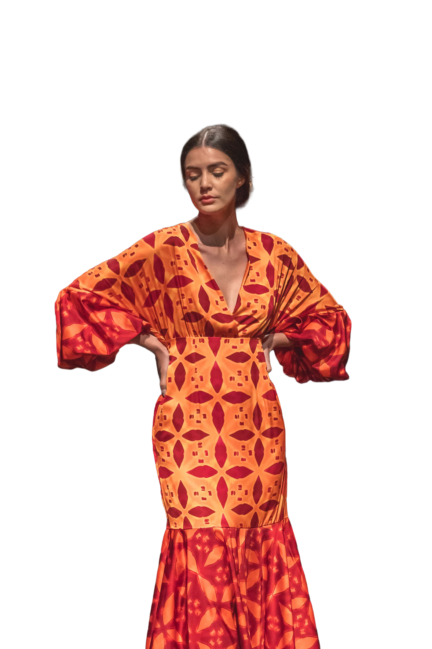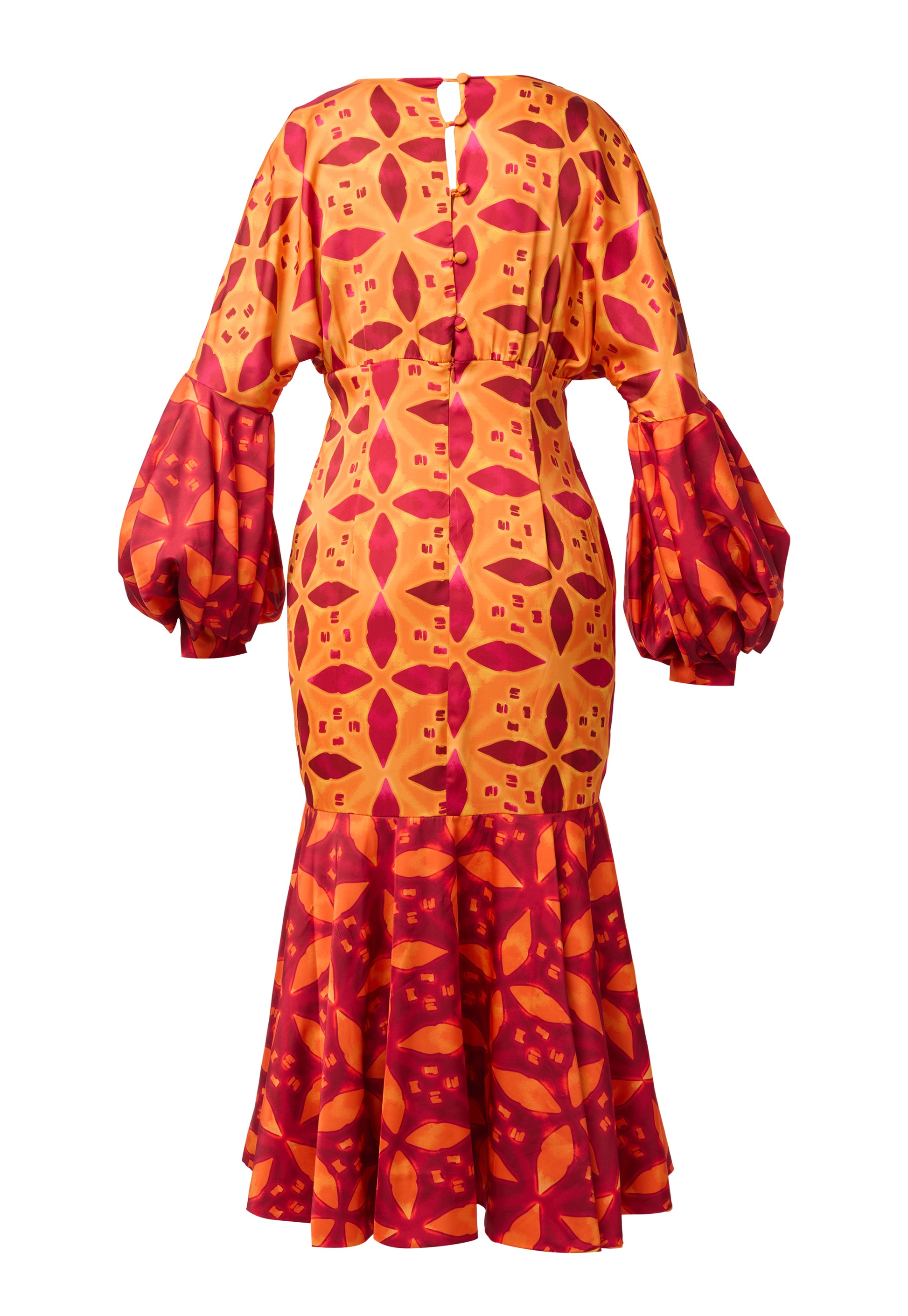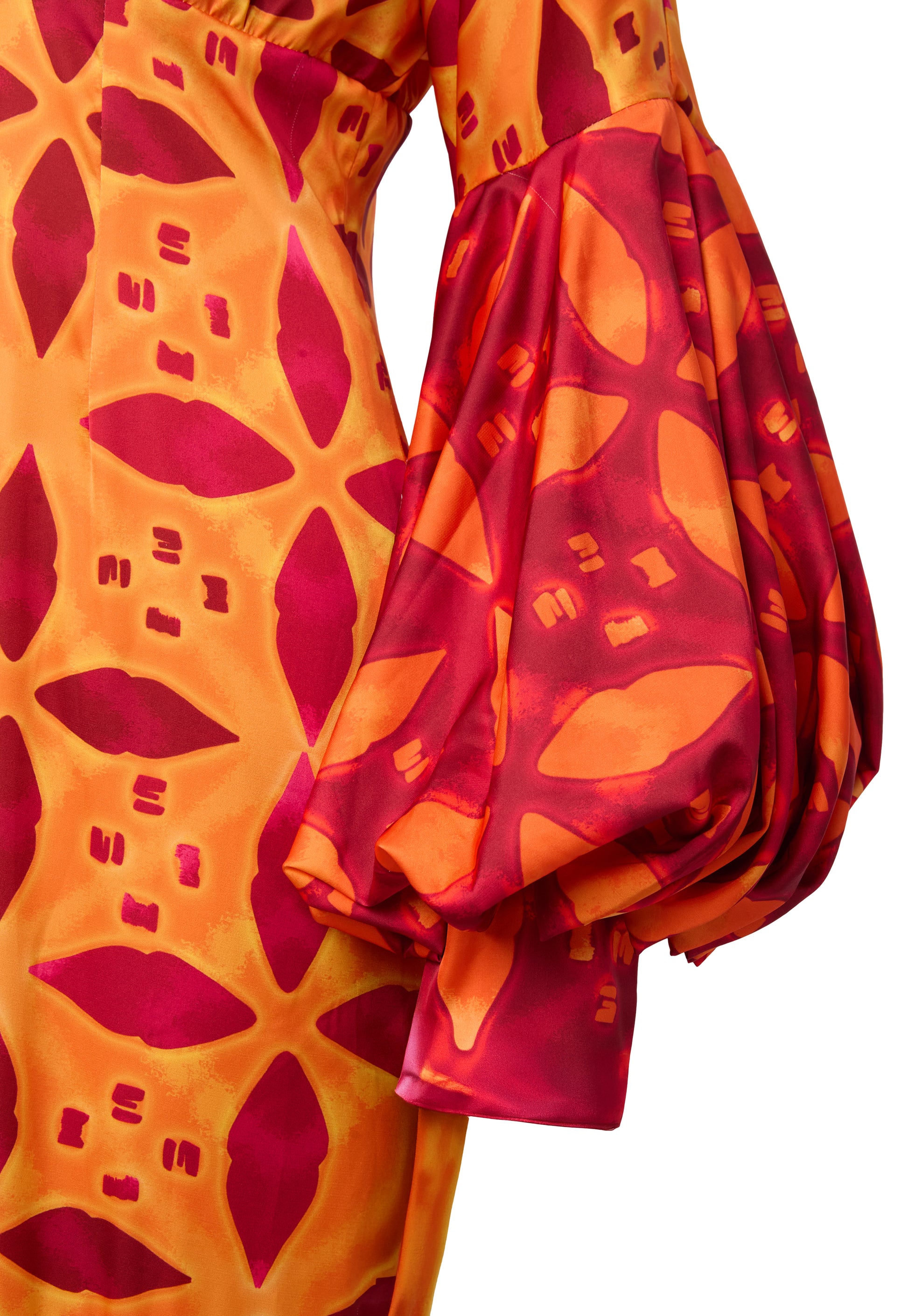 PIEZAS ÚNICAS. Vestido largo media pierna estampado en satin, con escote en V, mangas bombachas y cierre trasero con cremallera invisible y botones forrados en la misma tela. Falda al cuerpo que termina en arandela rotonda.