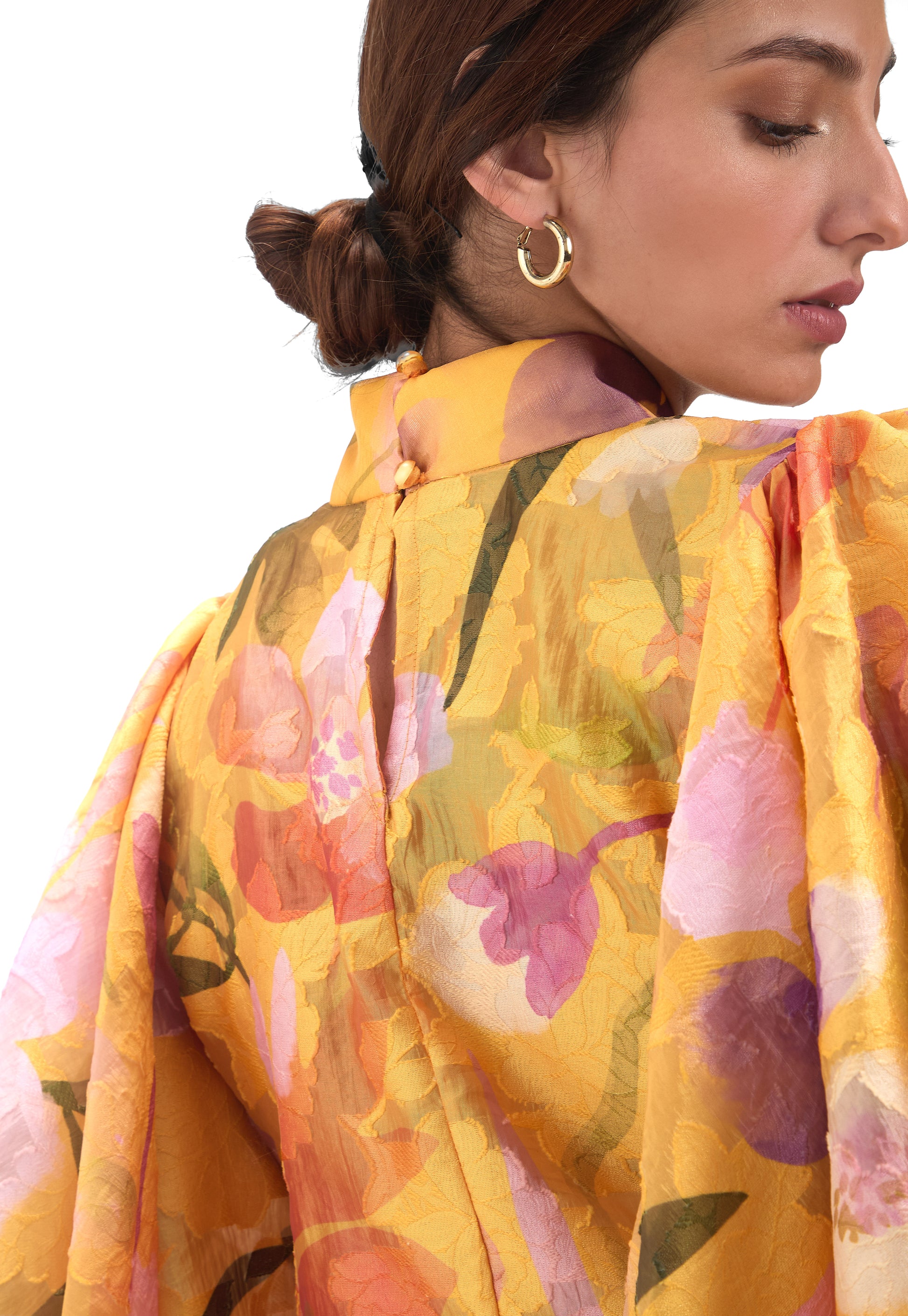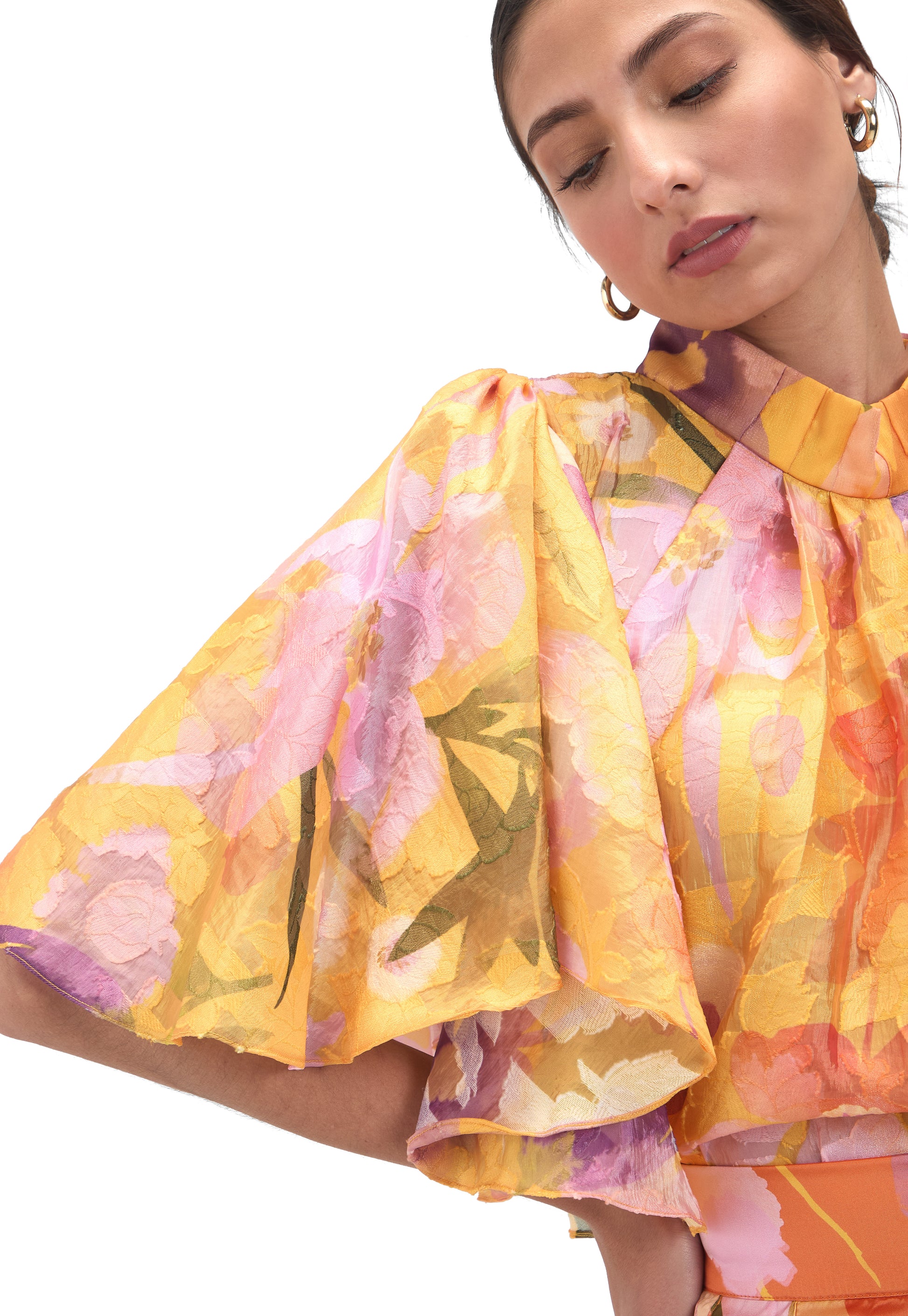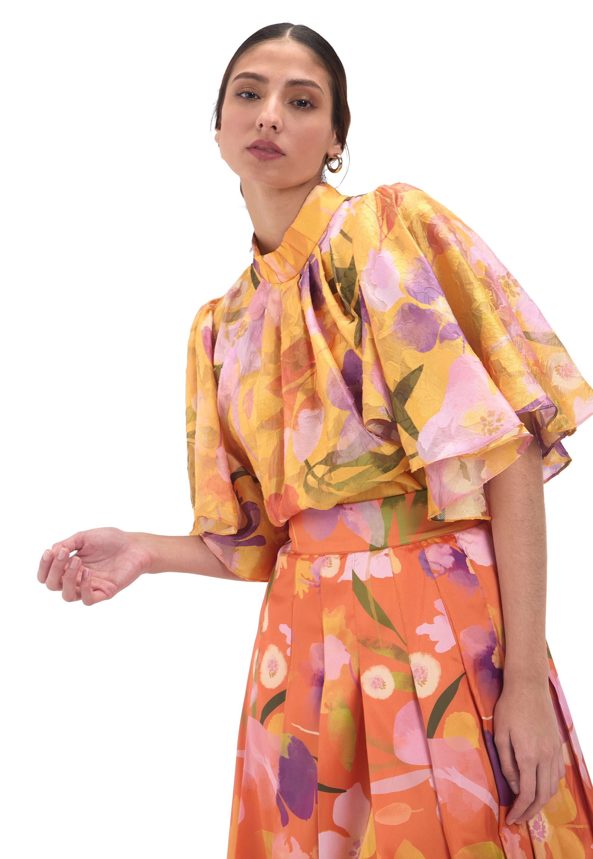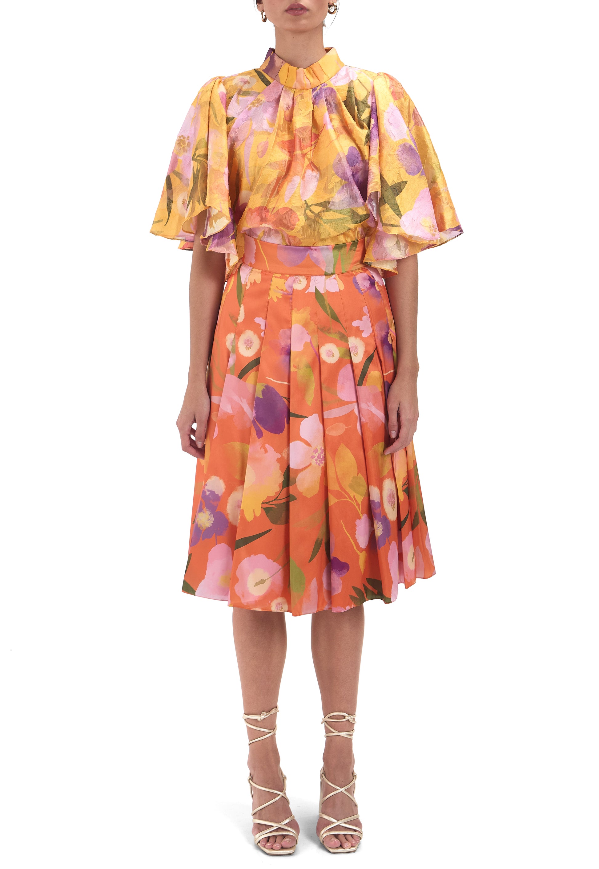 Conjunto de falda y blusa . La falda es en tela tafetta sedosa de prenses y la blusa en jacquard de organza estampada con mangas de arandelas y cuello alto con leve drapeado.
