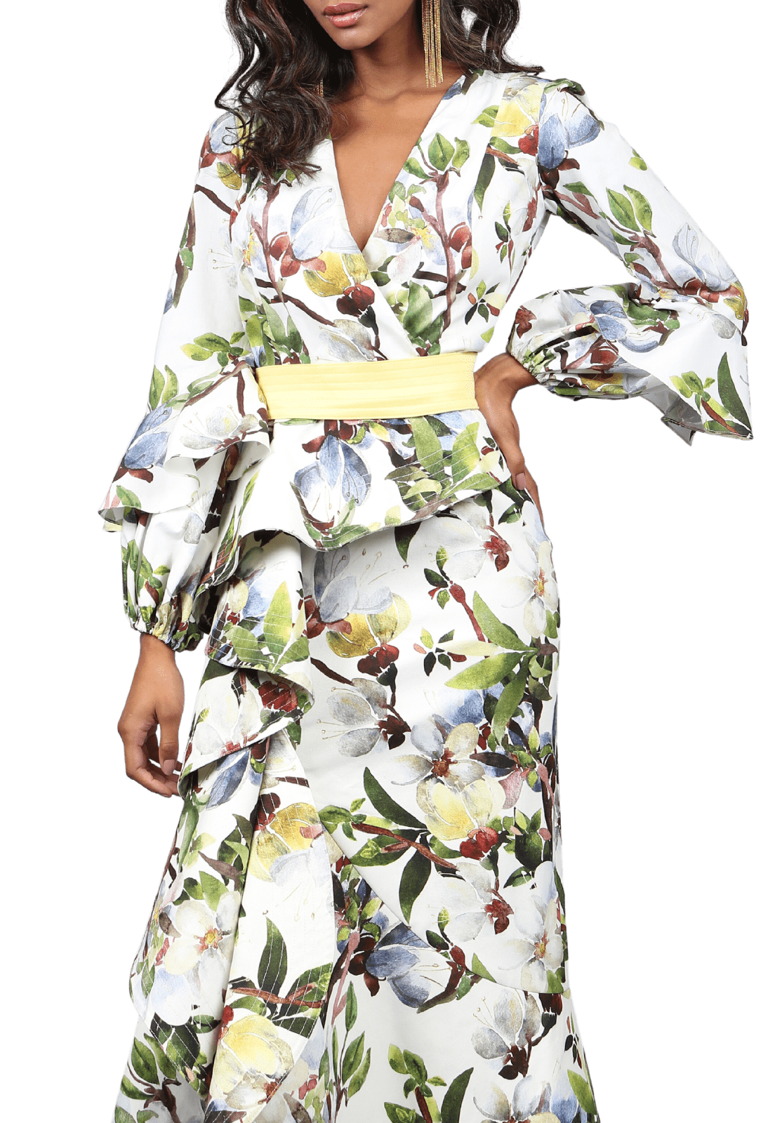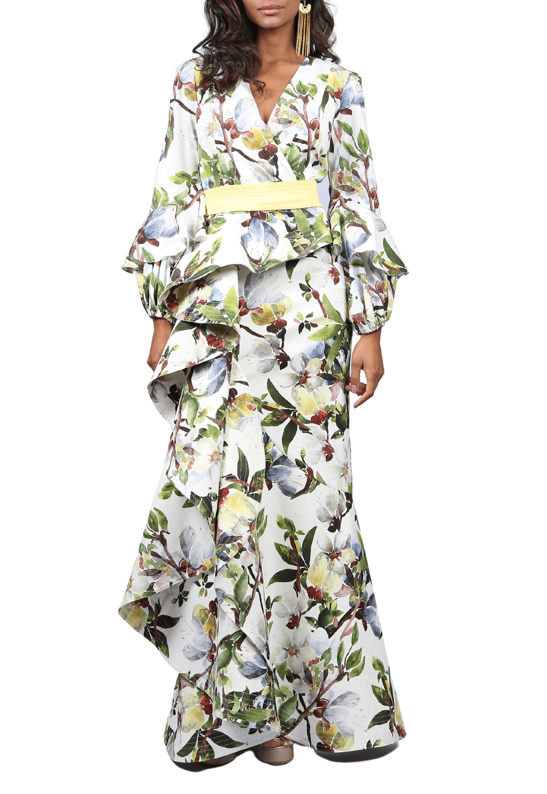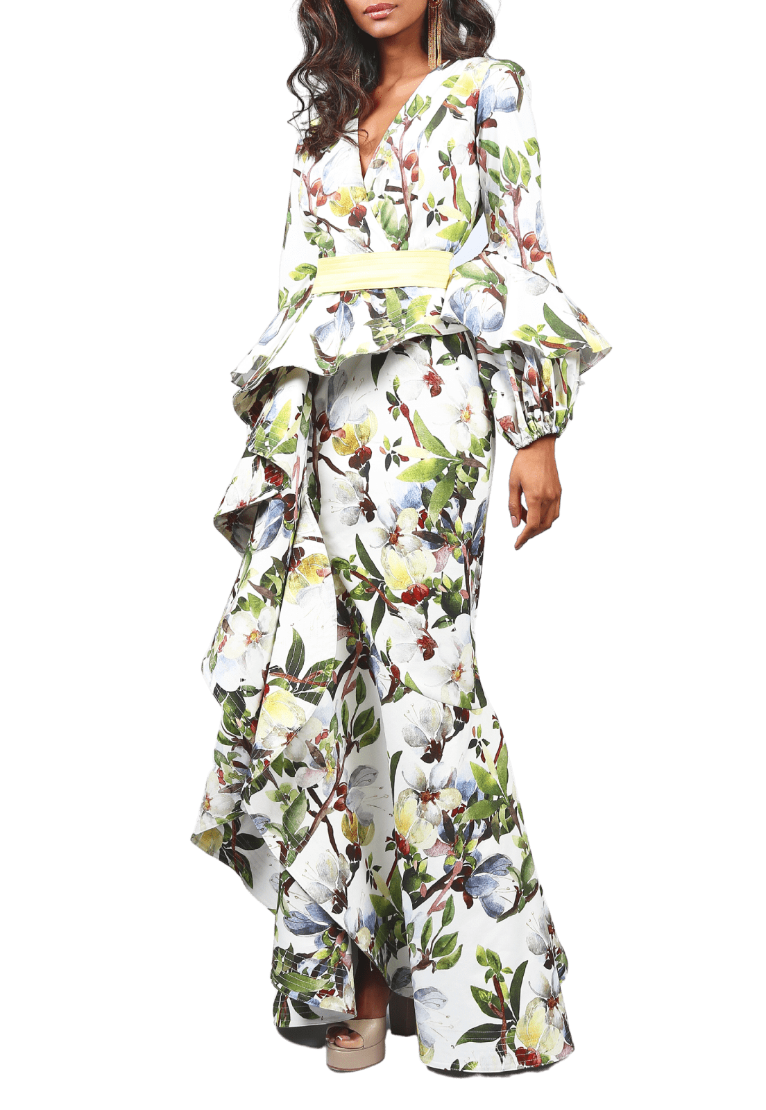 Vestido largo, escote en V con manga larga bombacha y falda con boleros. Silueta ajustada que realza la silueta femenina. Detalles de pespuntes tono a tono Lavado en Seco