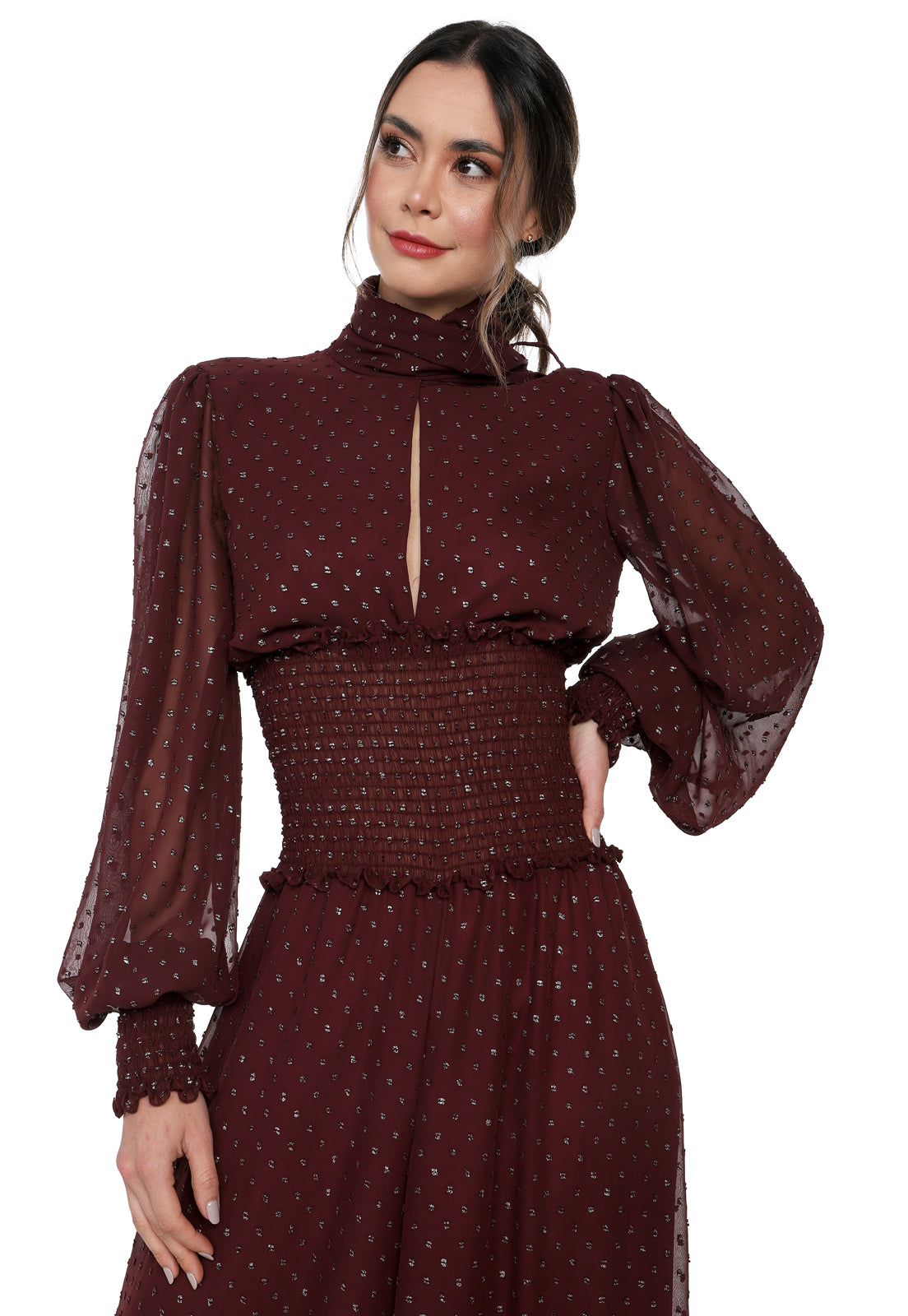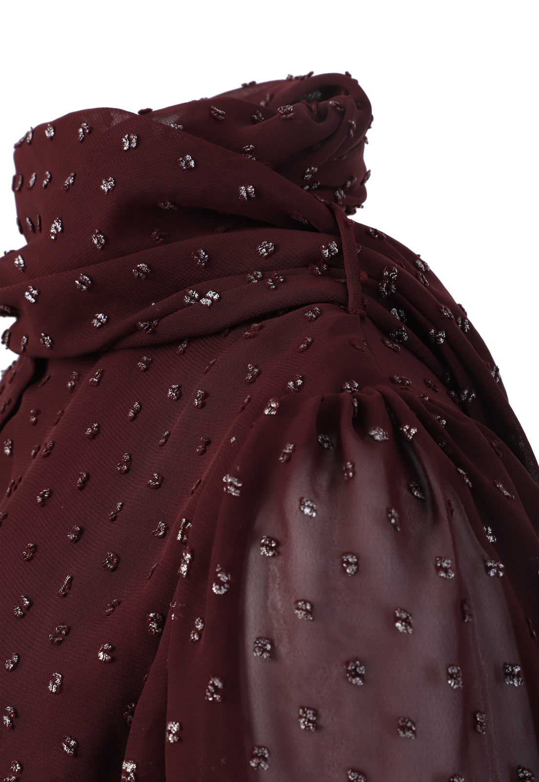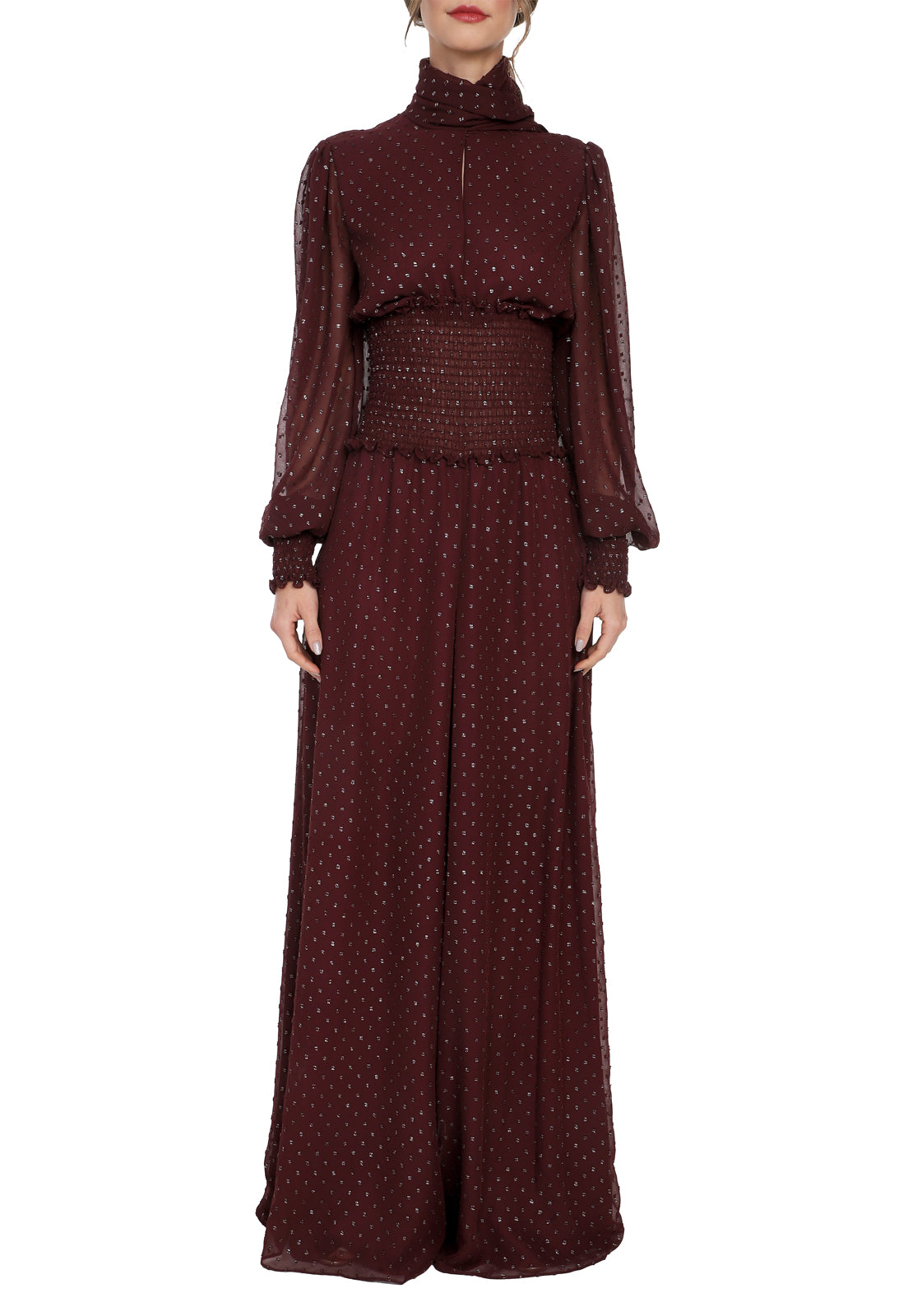 PIEZA ÚNICA. Enterizo en chiffon color berenjena. Lleva resorte en el torso , mangas bombachas y cuello alto. El corte del pantalón es palazzo y va todo forrado.