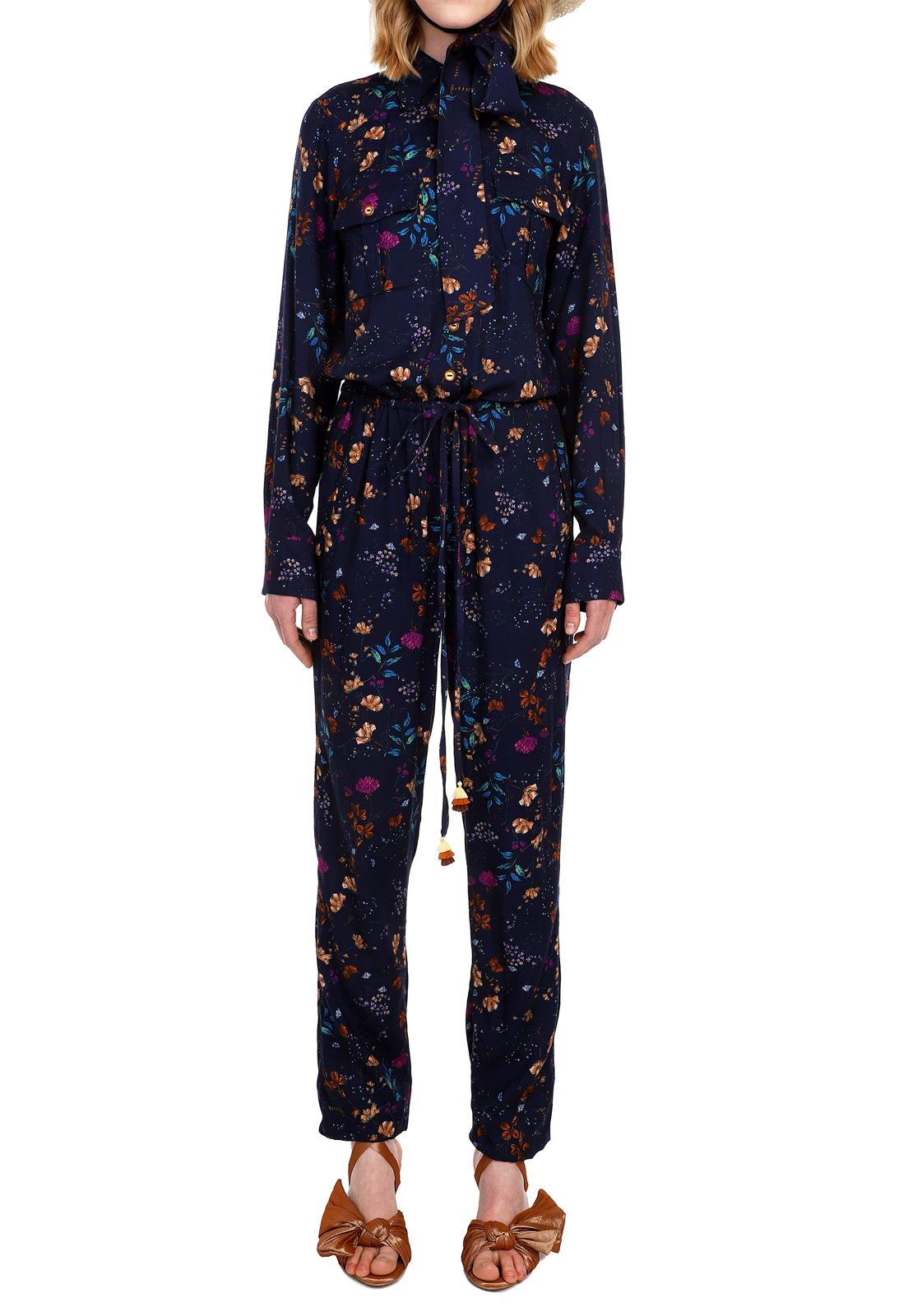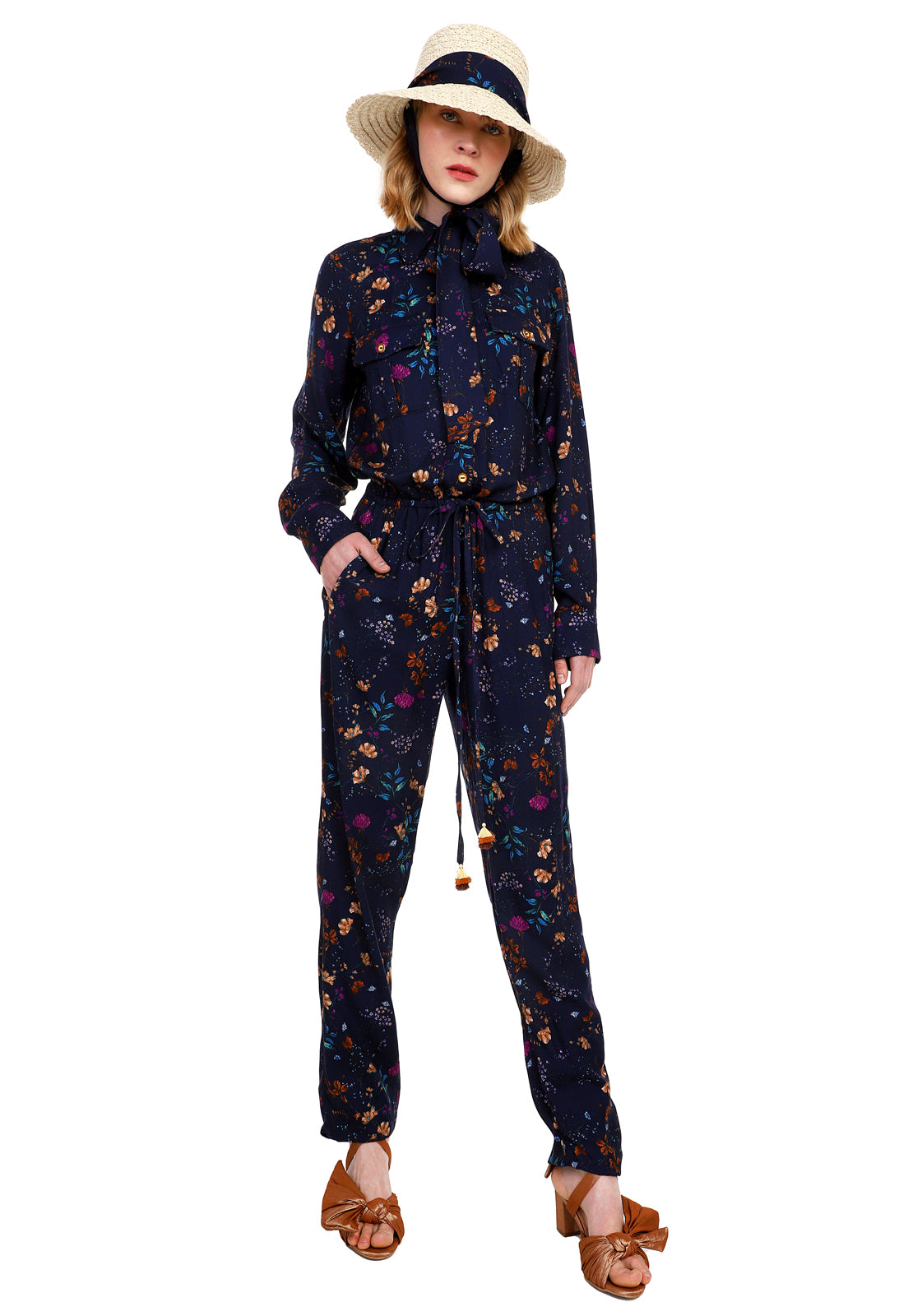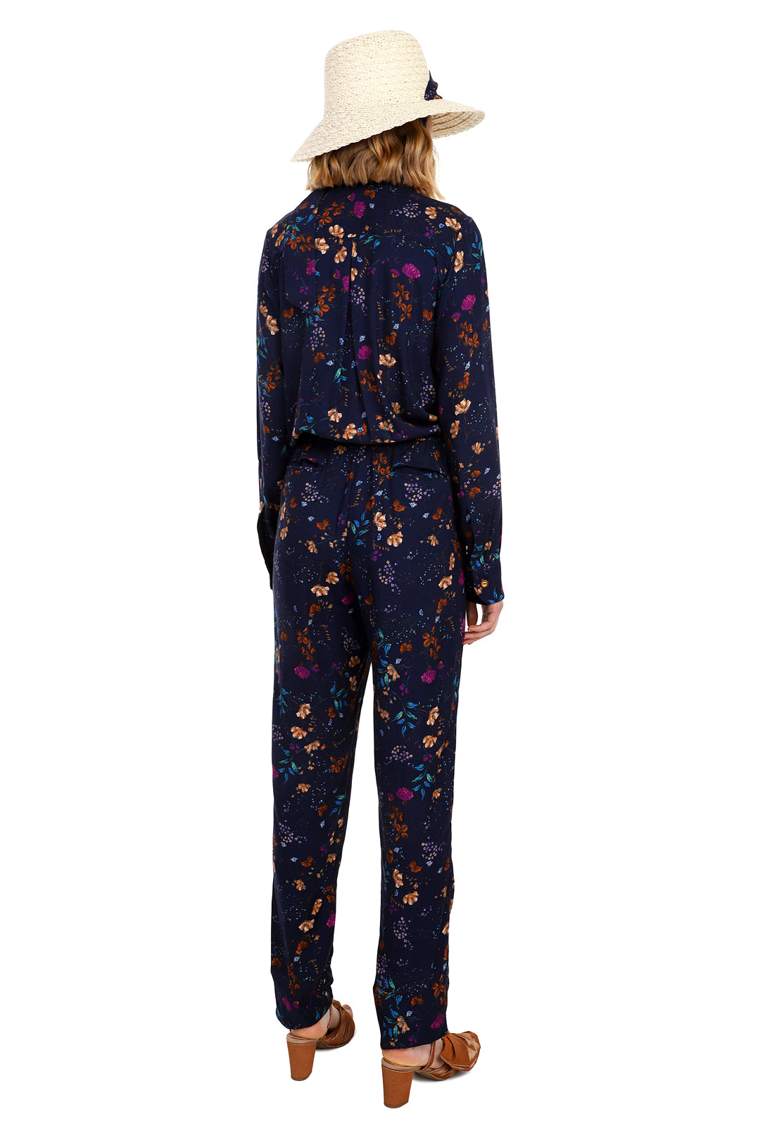 PIEZA ÚNICA. Enterizo confeccionado en chalis estampado. Con cuello camisero y amarrado en la cintura. Lleva bolsillos en la blusa y pantalon. La pierna es ligeramente entubada en la bota del pantalón.