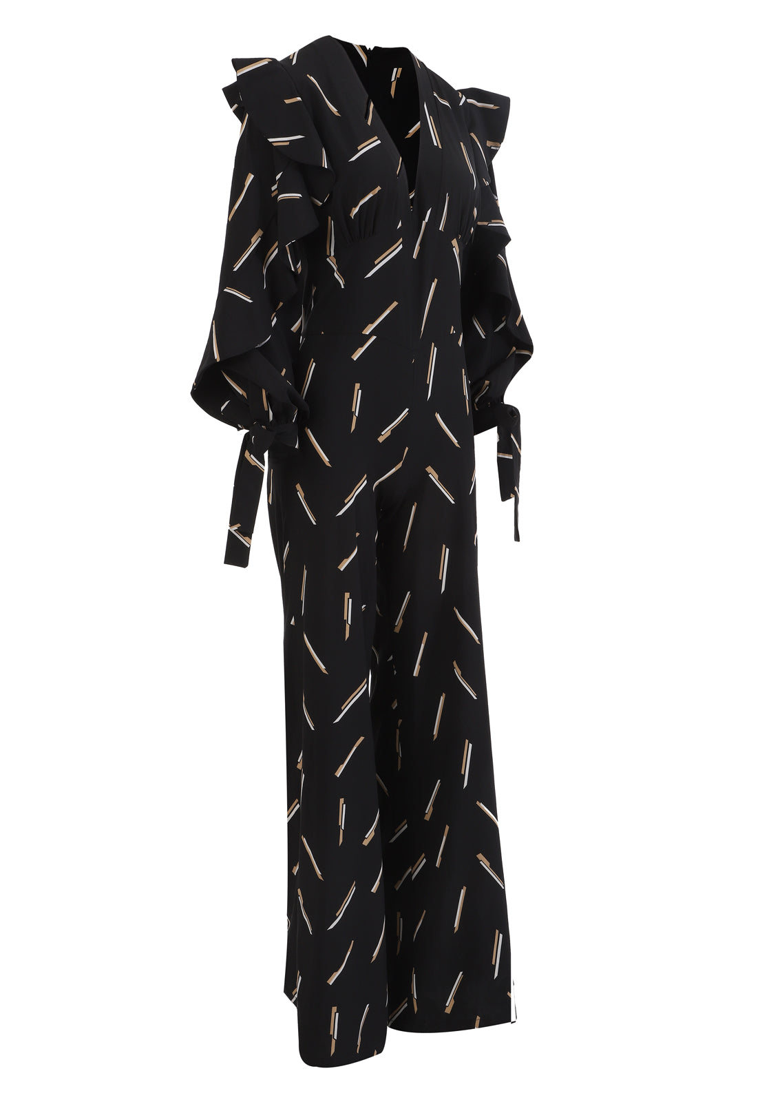 PIEZA ÚNICA. Enterizo elaborado en seda estampada. Cuello V y corte imperio. La pierna es recta y amplia y las mangas largas con detalles de lazo.