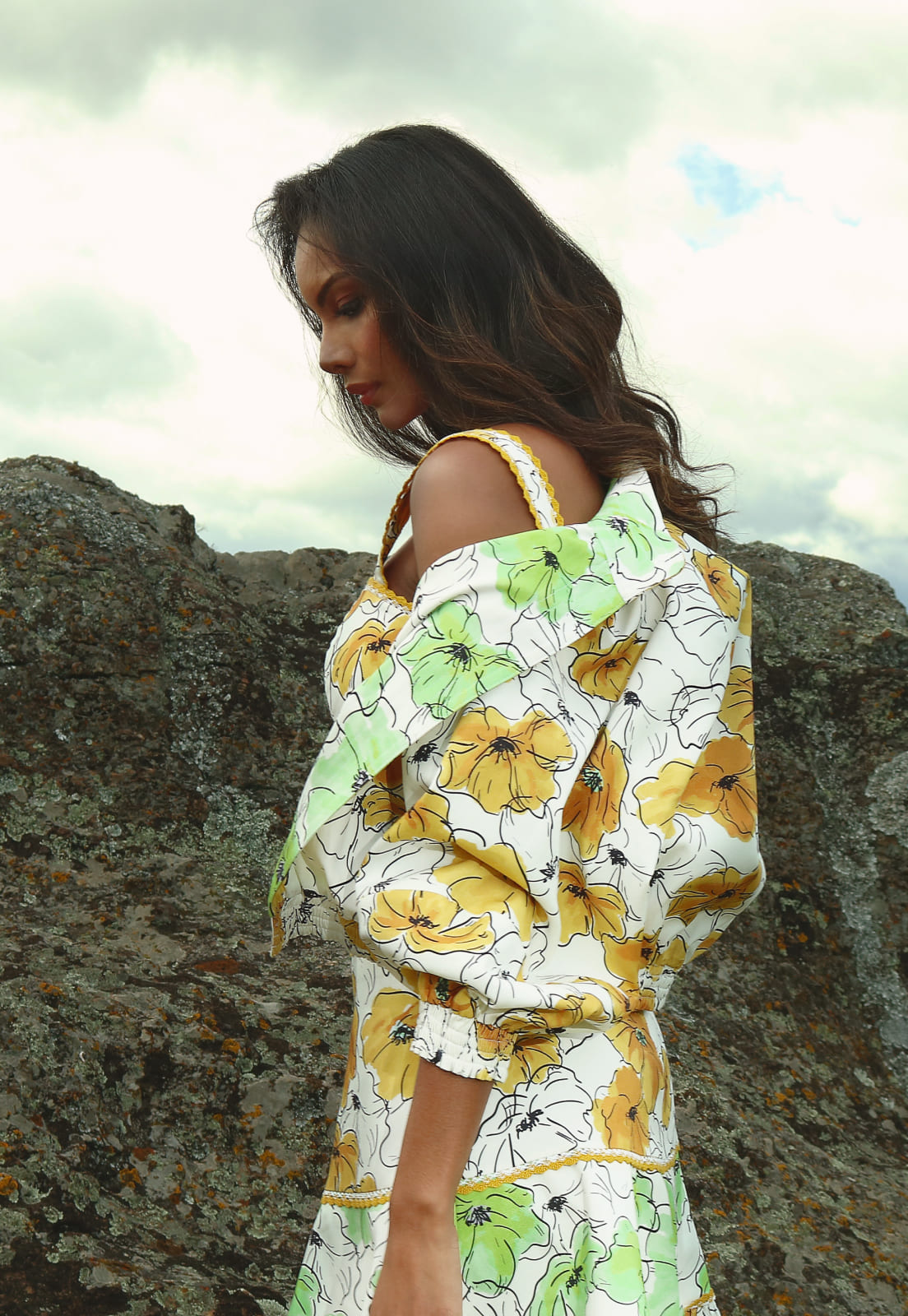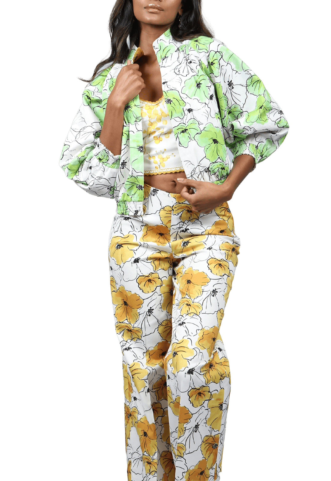 Chaqueta bomber doble faz, cuello alto con detalles de pespuntes tono a tono, elaborada en tela estampada. Elástico ancho en puños y ruedo. Lavado en Seco.