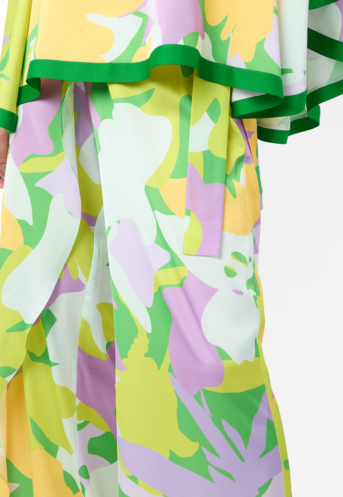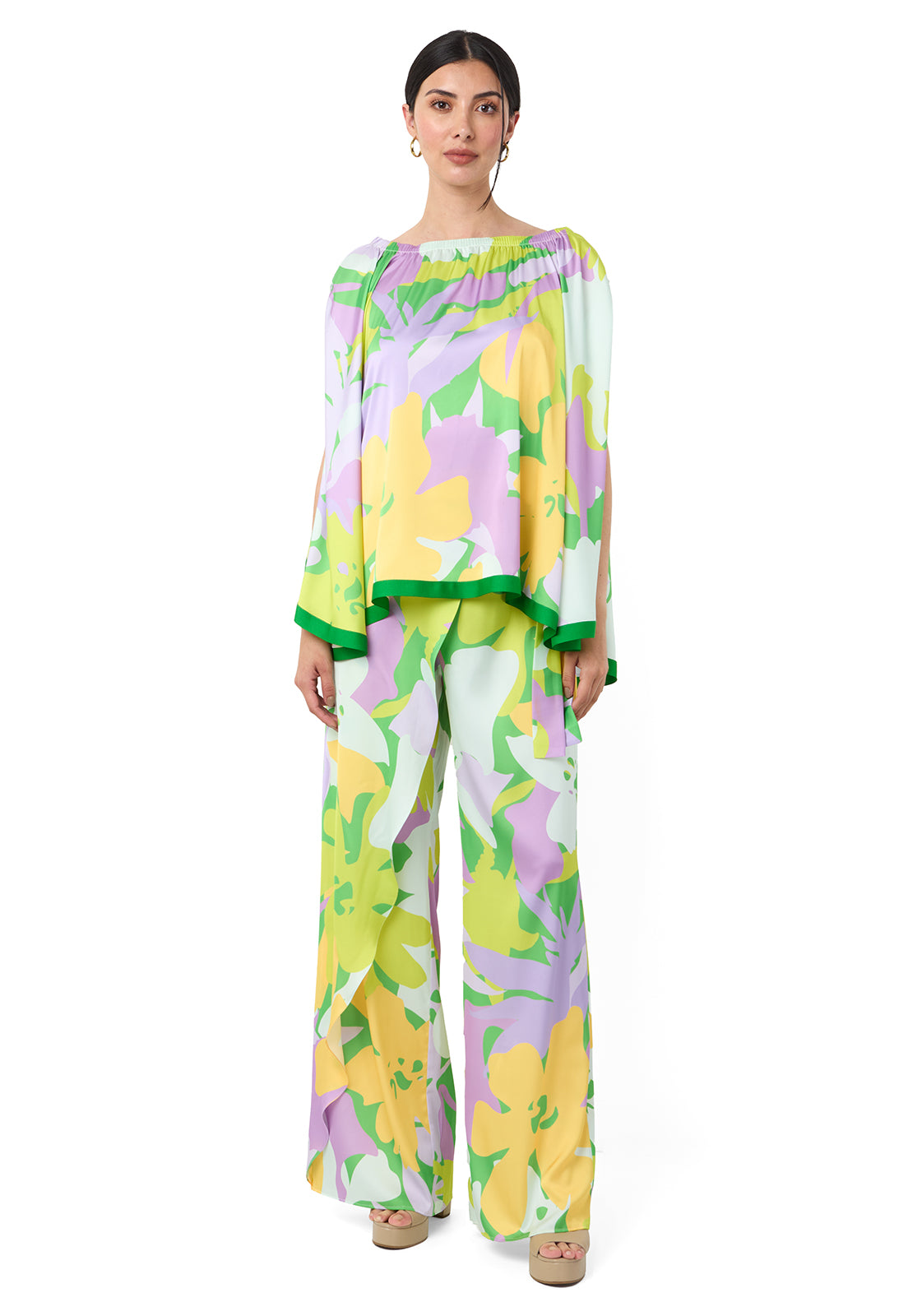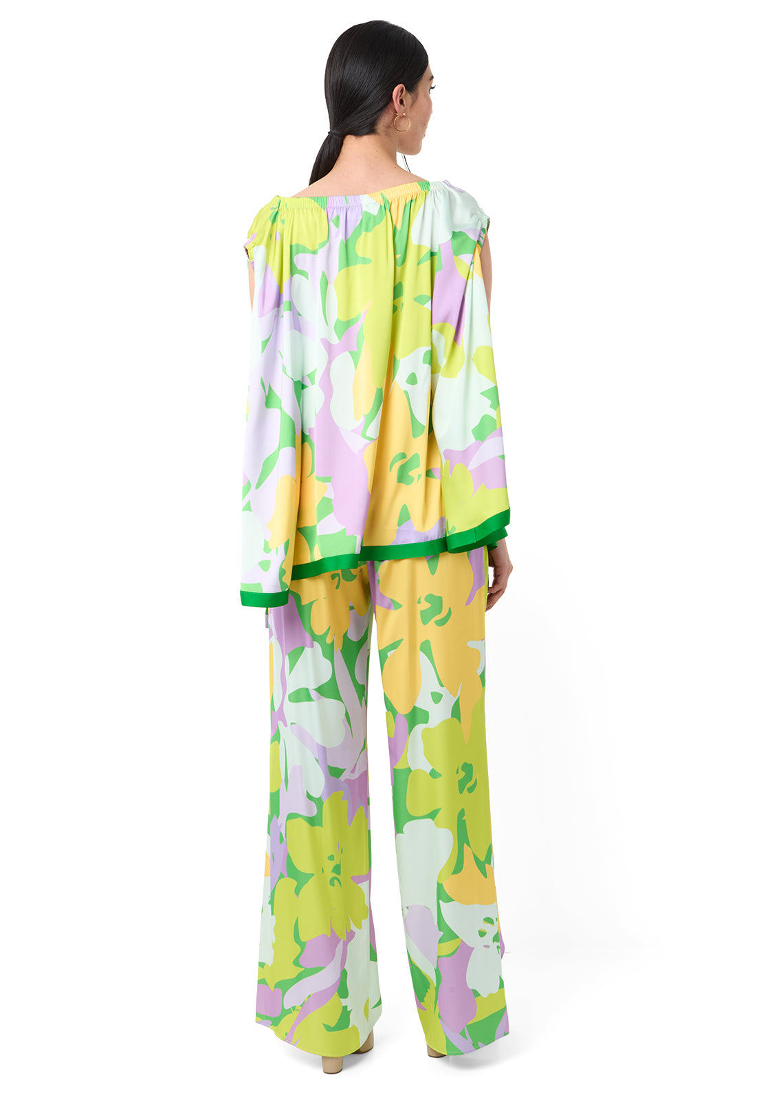 PIEZA ÚNICA. Conjunto de pantalón y blusa. La blusa es una especie de capa con aberturas decorativas y el pantalón es de corte palazzo amplio con resorte en la cintura y cremallera para mayor comodidad y ajuste en la cintura. El pantalón va con una sobre capa que amarra en la cintura en el delantero.