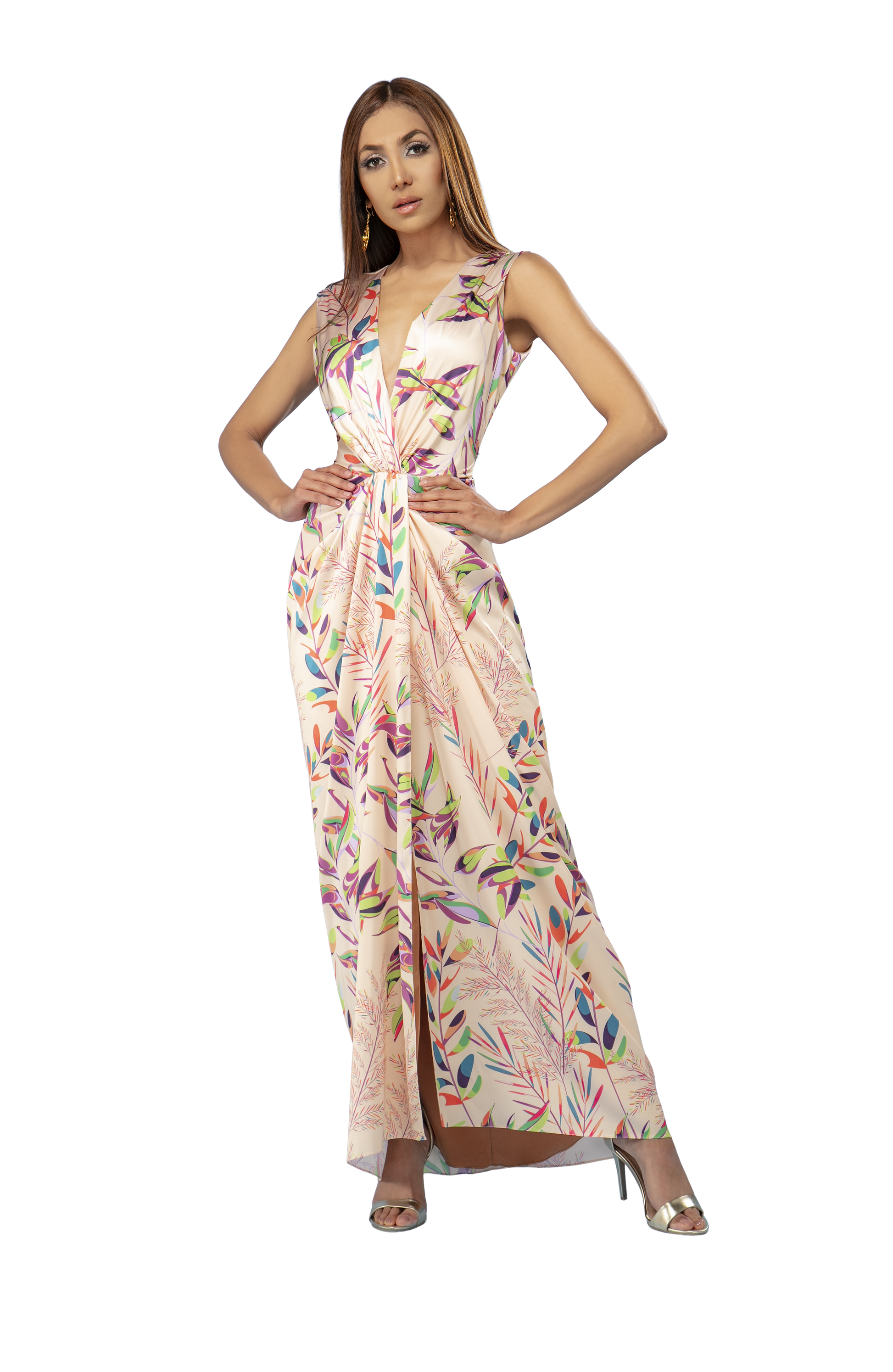 Vestido confeccionado en satin con escote V profundo. Es un Best Seller de la marca. La falda es recta con drapeado en el centro frente y abertura en el delantero.