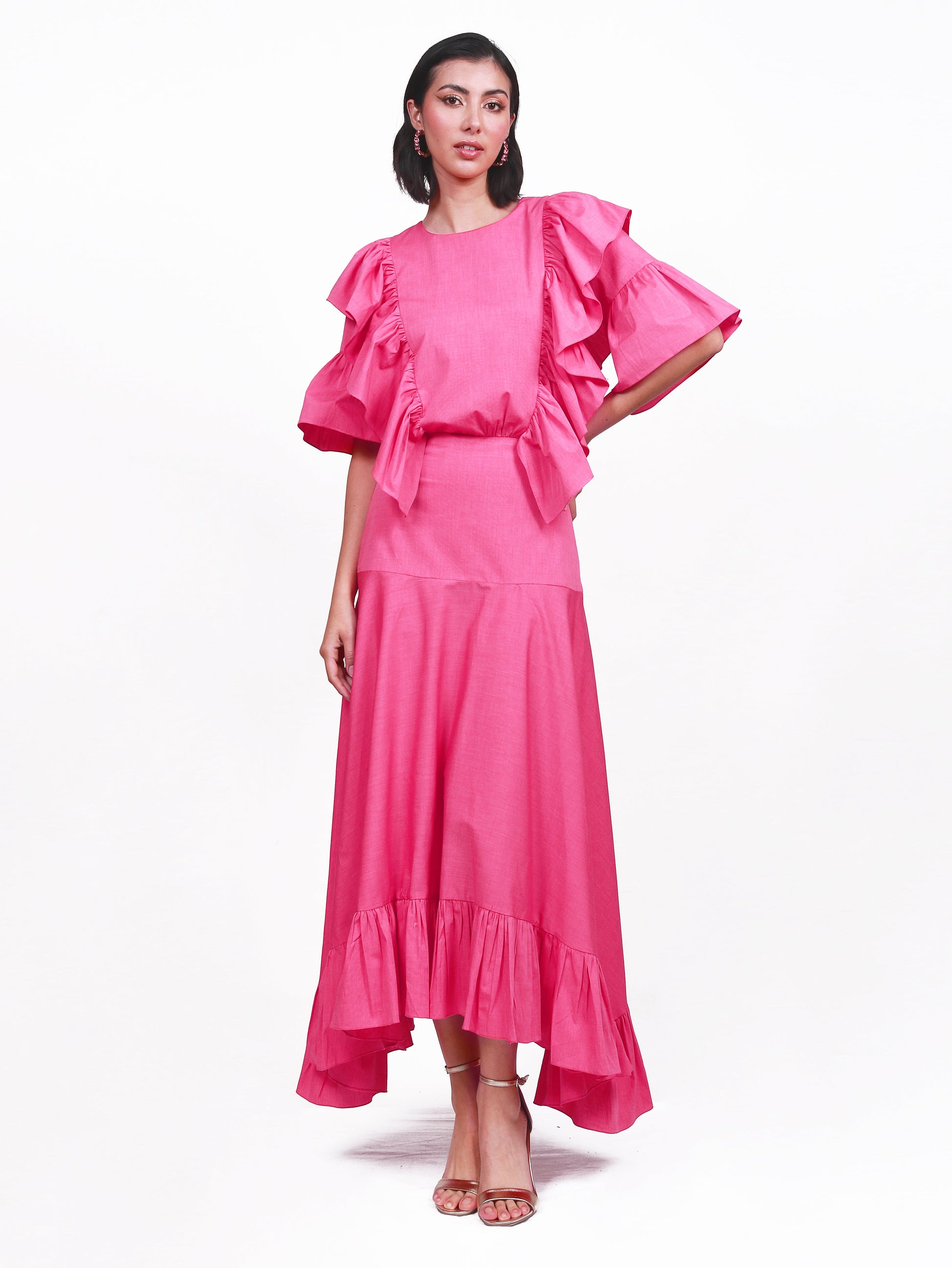 Vestido en popelina de algodón color coral fresa. Blusa y falda con detalles de arandelas. Largo midi. Con mangas.