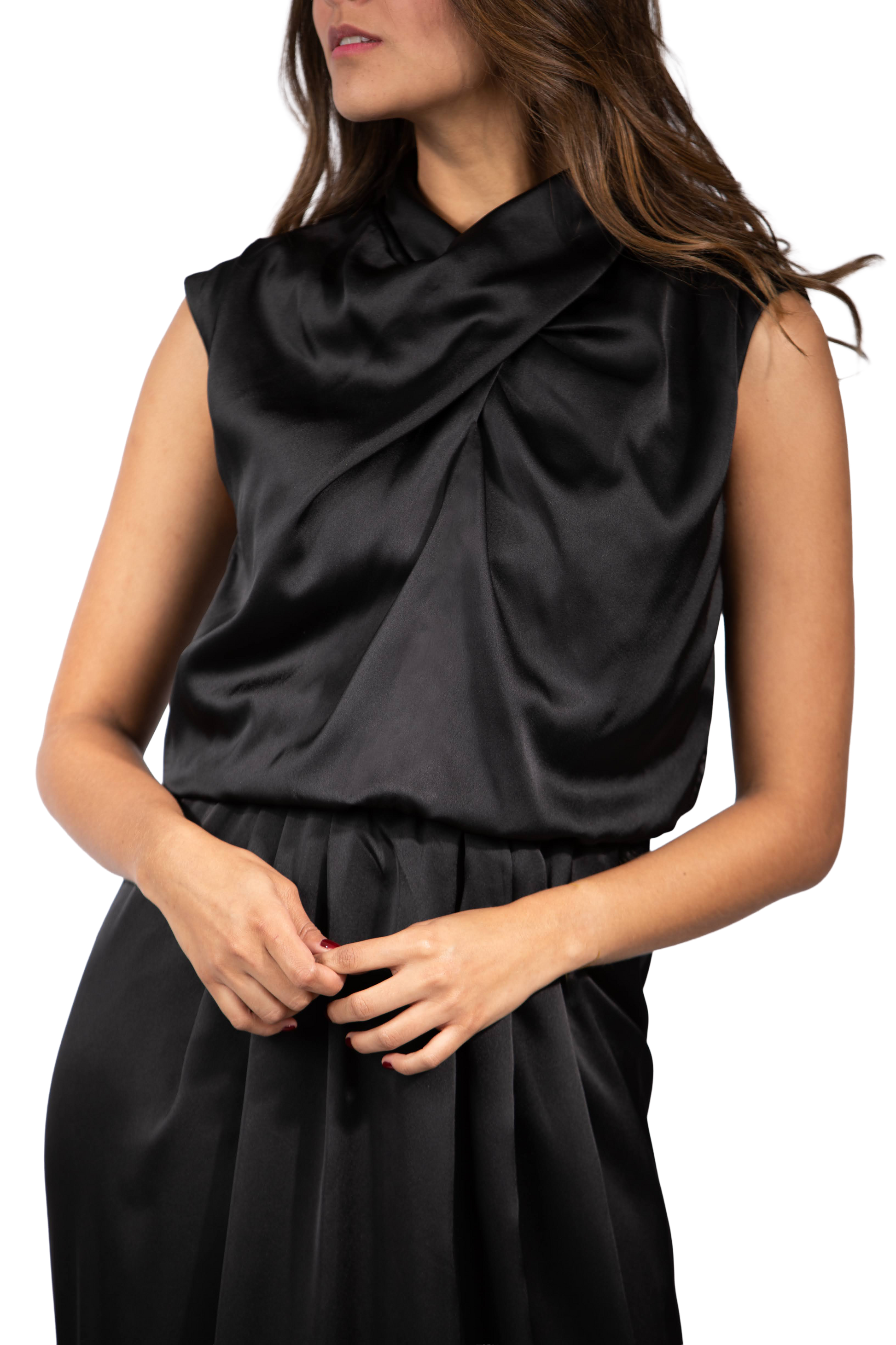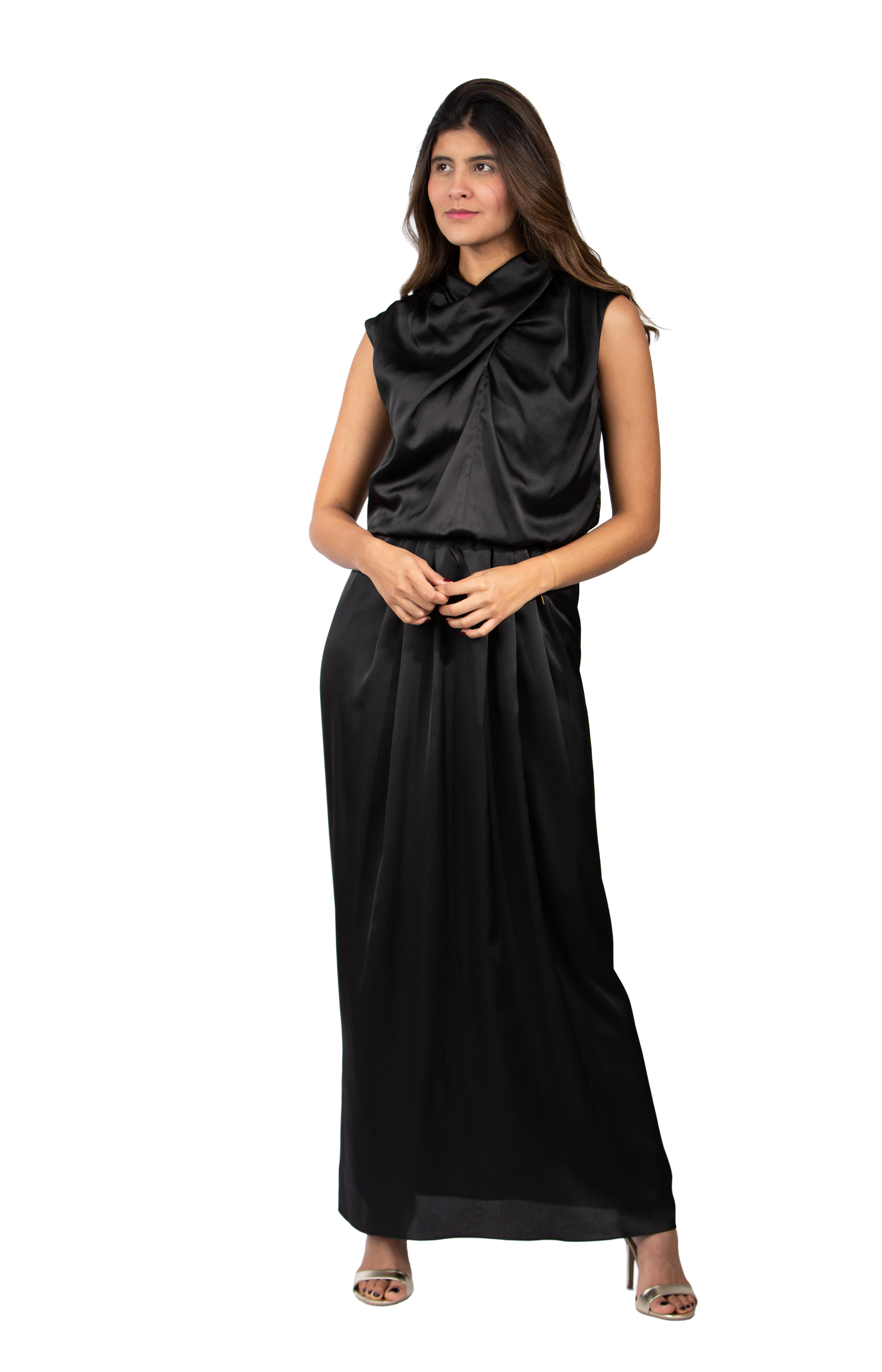 Vestido en satin de seda con detalle de nudo al cuello y falda con prenses en el centro frente. La parte de la blusa es un poco bombacha y tiene un suave recogido en la cintura que le da una flexibilidad a la talla. Lleva cierre invisible en la espalda.